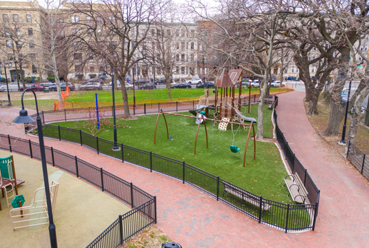 The patent-pending Turf System is designed from the ground up. High-quality synthetic turf is laid on top an array of tiles made from ultra-durable vulcanized rubber, engineered with a hollow-cone design that is back-filled with rubber mulch. The result is a beautiful turf surface, with soft cushioning and without the mess of traditional turf bugs. The turf system provides consistent safety performance year after year, wet or dry under all weather conditions.
